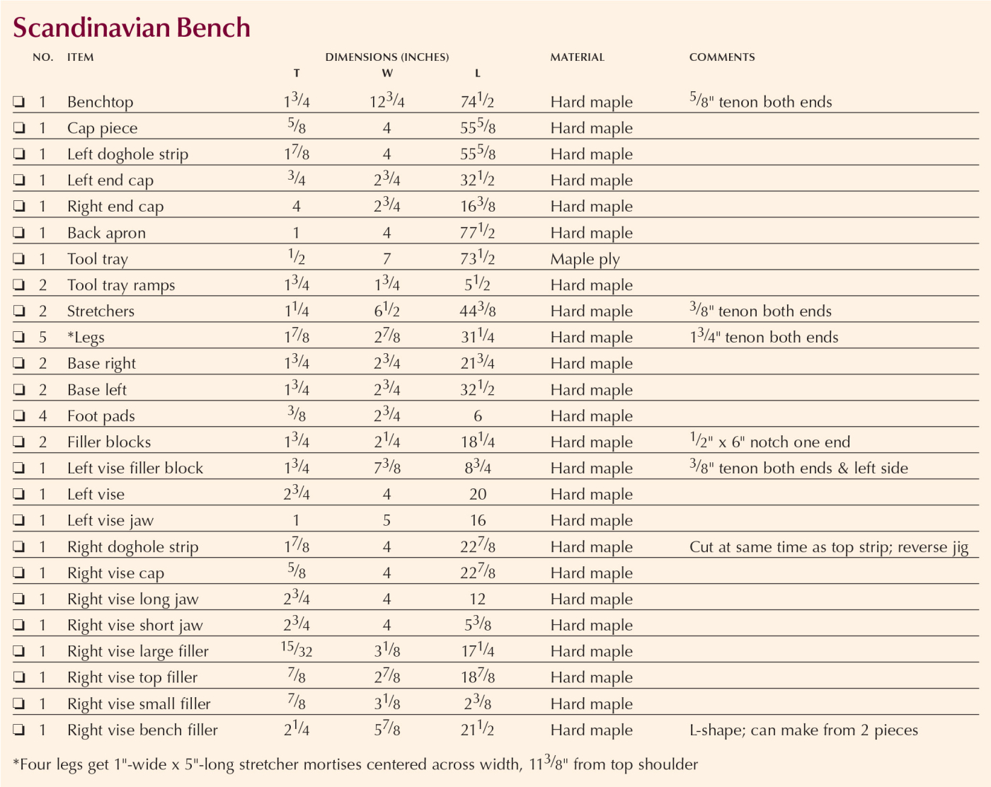 To address some of those issues, I made several design modifications and incorporated some new hardware to build a bench that I am very happy with. I have, however, used the same or similar part names, listed in the same order, as Frid did in his book (in case you wish to view them side by side).