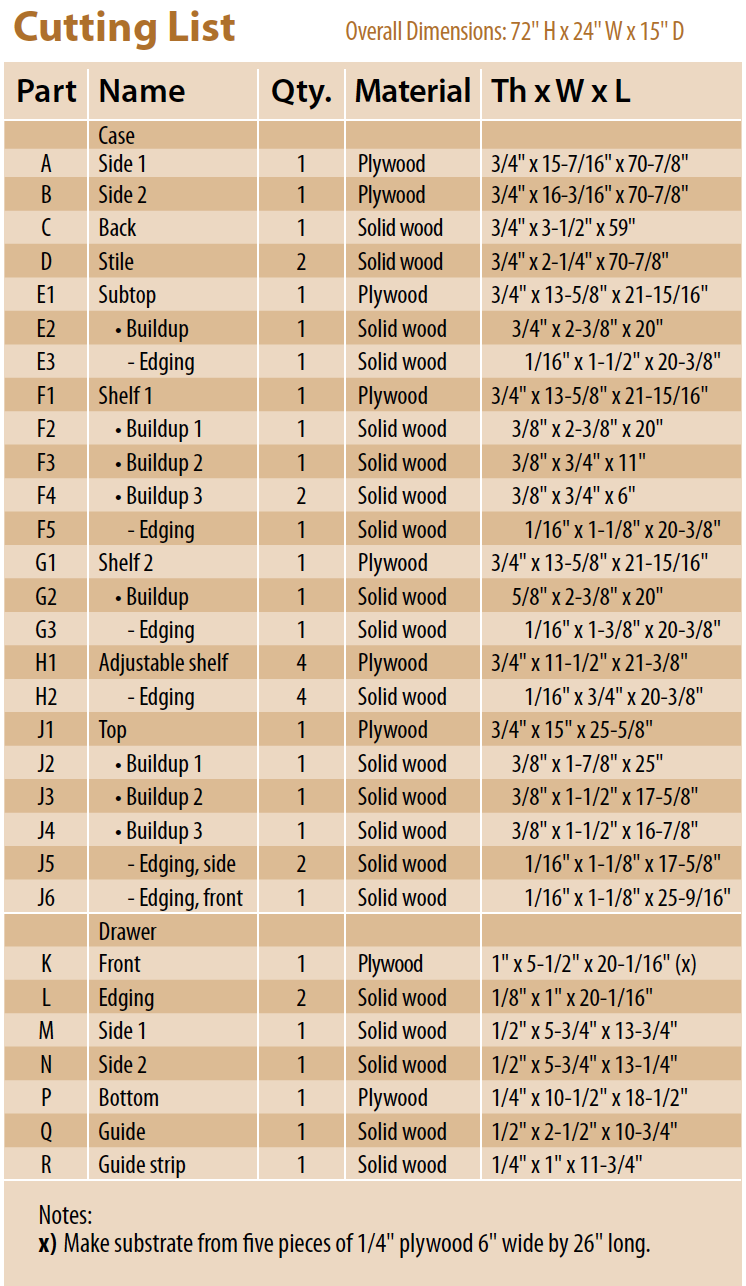 The subtop (E1) and the two fixed shelves (F1 and G1) have front edges that are thicker than 3/4″. To achieve this look, glue “buildup” pieces (E2, F2, F3, F4 and G2) to each part. Trim the front buildups flush (Photo 9).
