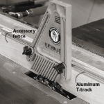 Another necessity to ensure an accurate and safe cut is to use a featherboard that presses the work against the table. There are lots of commercial featherboards available, or you can certainly make your own. As you can see from the photo at right, I also added an aluminum T-track (in a rabbet, no less) that allows me to quickly adjust the featherboard’s position. That’s mighty handy when dealing with project parts that are of different thicknesses.