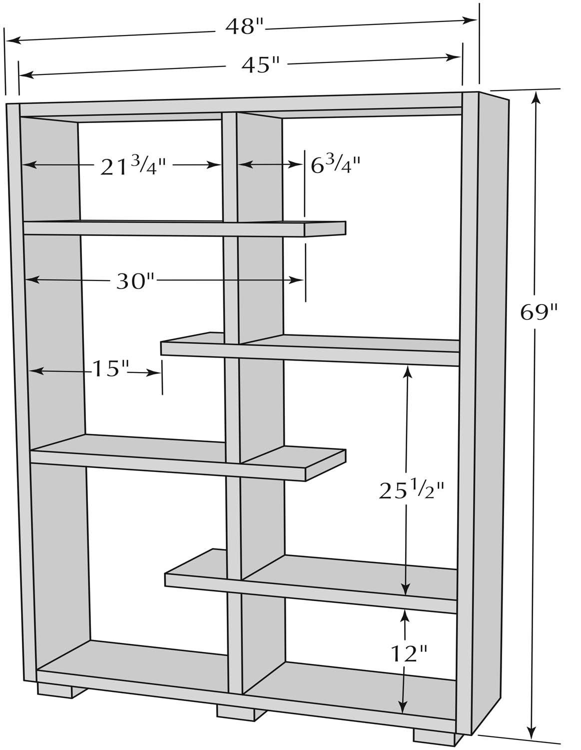 Three 12′-long 2x12s will provide enough material to build the shelves as shown. You may have to cut them (or have them cut) to get them home, but longer lengths will be straighter and of better quality than short stuff. Pick through the stack and select the straightest, nicest-looking pieces.