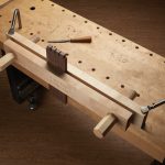 After sawing the log into boards Dan laid up a few of them and arrange them edge to edge in preparation for glue-up. Notice that the middle board has elongated dimples along its middle. These interesting-looking cavities are actually the tree’s pith and are one of the visual hallmarks of the Paulownia tree. After gluing the boards together Dan hand-planed them and then cut the top to shape.