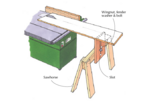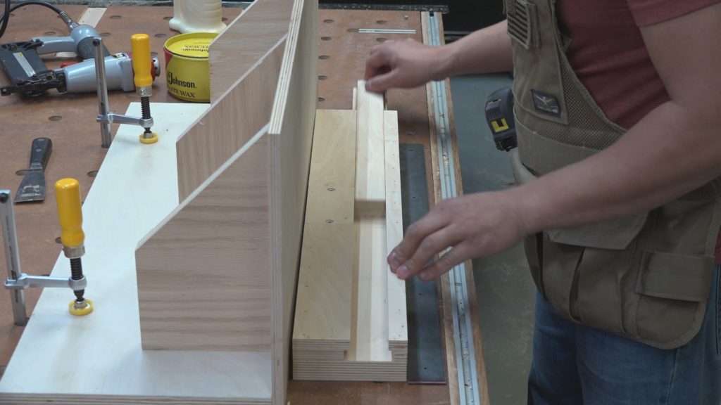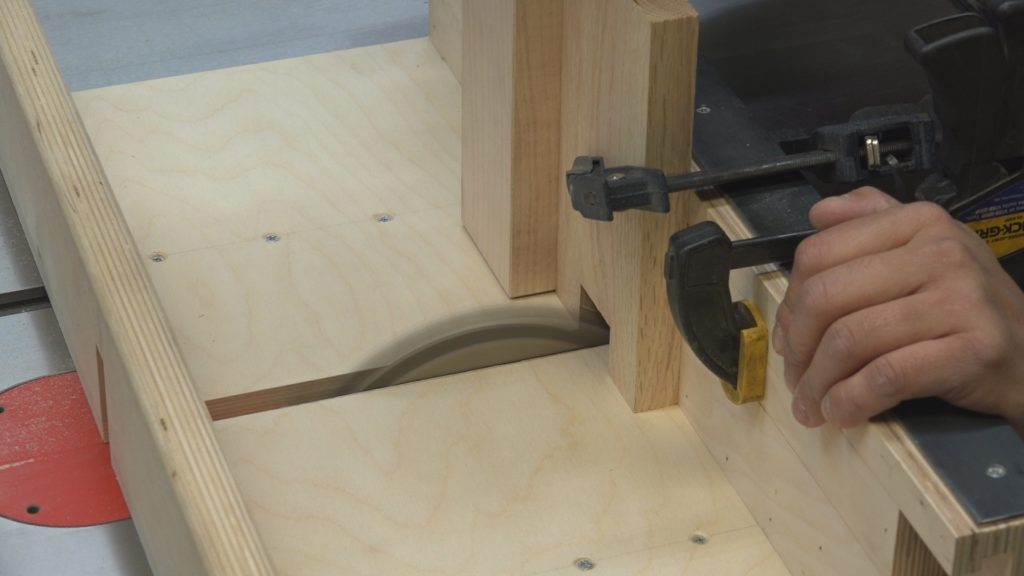 The back fence consists of one layer of 1” Baltic Birch and two layers of 1/2” Baltic Birch attached with glue and 3/4” brad nails. I use a shop made right angle clamping guide to keep the bottom of the fence pieces flush as I glue and nail down the pieces. Make sure nails are not in line with the blade. The moveable track is encapsulated between the layers of Baltic Birch.
