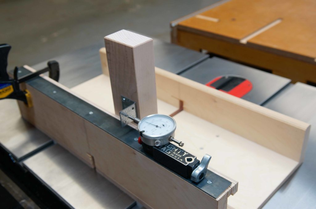 The dial indicator attached to a magnetic base contacting the corner bracket on the back of the stop block.