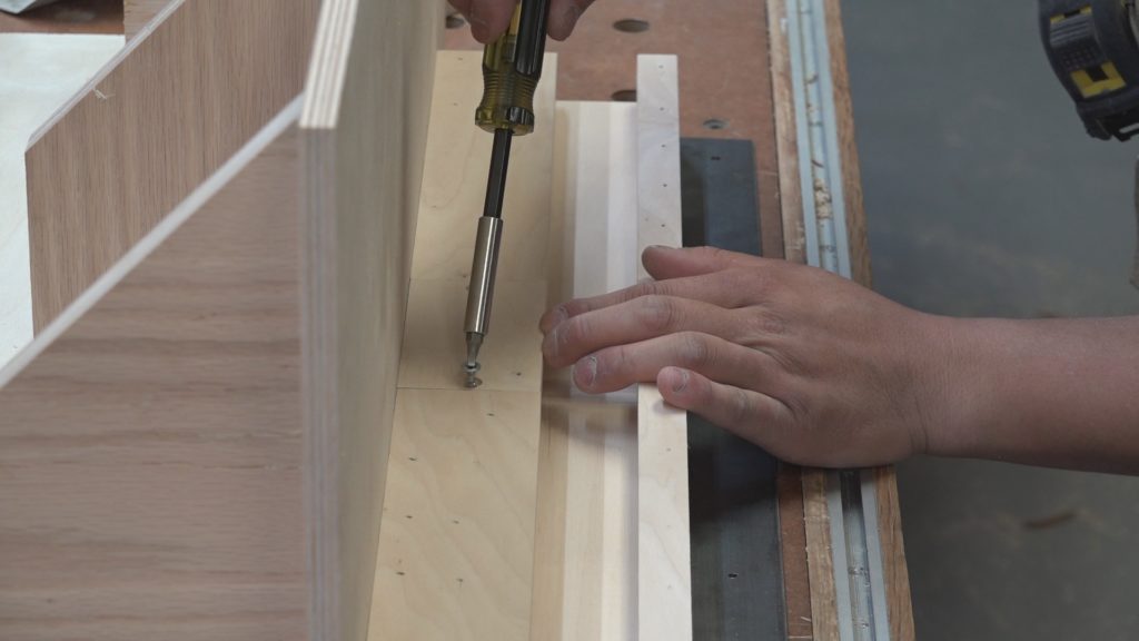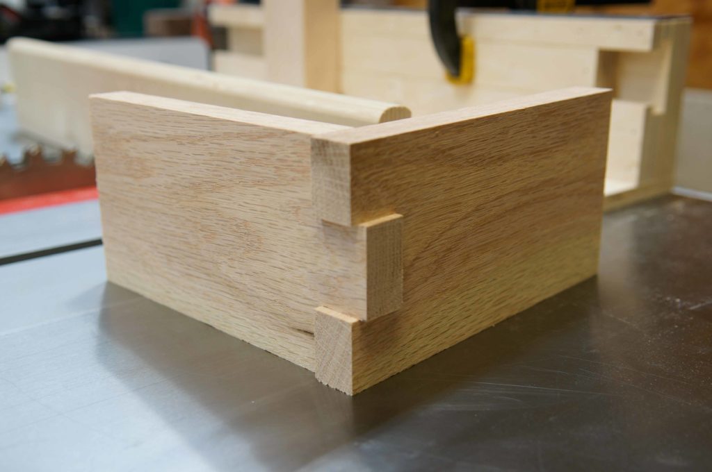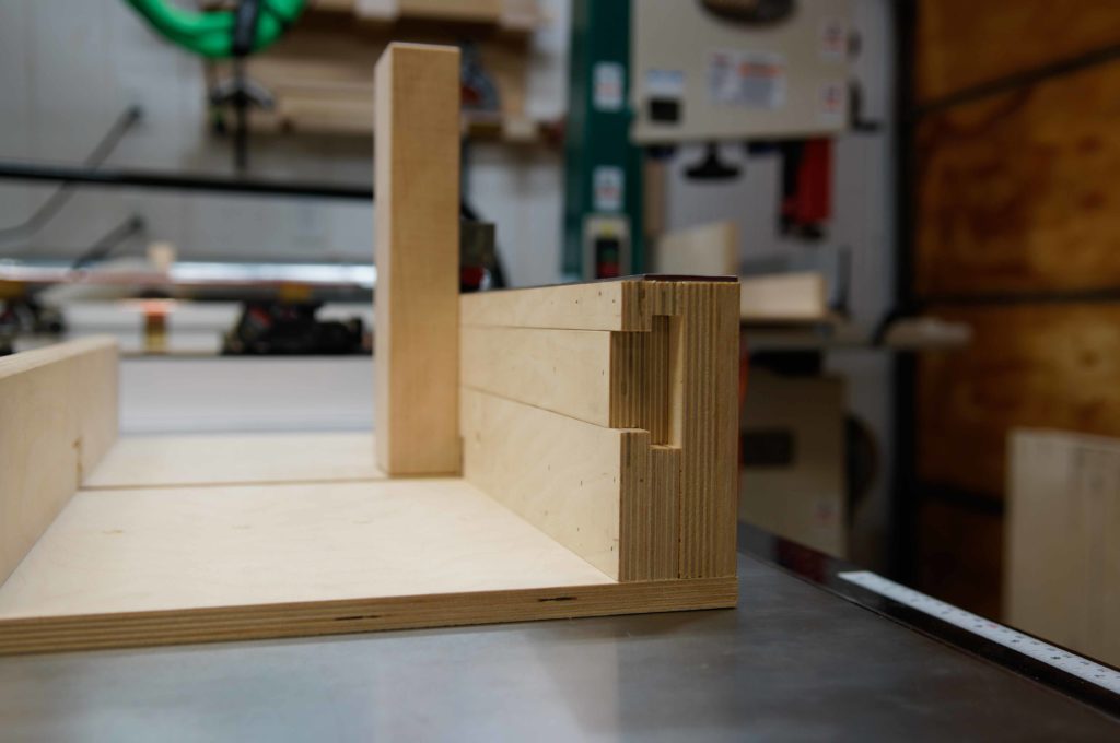 First, I choose the width of my dado set to be smaller than the width of my fingers, but wide enough to define the width of the finger by flipping the workpiece horizontal and taking a second pass. For me, that’s usually 5/8″ or 3/4”. Next, I set the height of the dado set to about 1/4” greater than the thickness of my material. This gives the signature protruding finger joint look. I then set the stop block to define the center finger. I make my first cut, flip the board horizontally, and then make my second cut. If I like the size of the center finger I’ll do this for all of my drawer fronts making sure to hog out the waste on either side of the center finger. Typically, the drawer front receives the center finger.