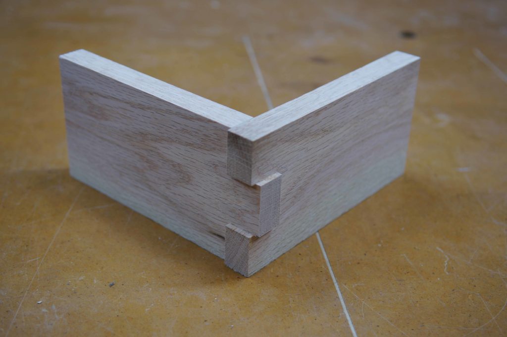 The center joint of a 5-finger joint needs to be refined on the test piece first. Then, all subsequent drawer pieces can be cut making sure to leave the waste on either side of the center joint to give room to define the outside joints.