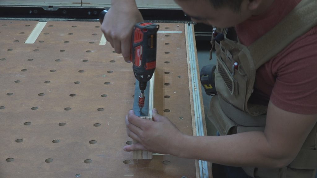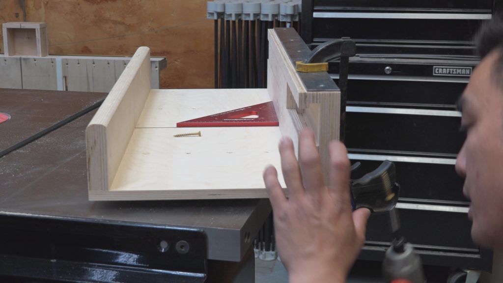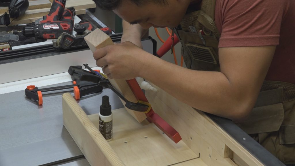 I make a partial kerf cut into the sled and use a precision triangle to square the back fence to the saw kerf within the sled. Once the fence is square I attach the fence with some 1-5/8” screws. I want to make sure the stop block is perpendicular to the fence and base of the sled. To do so, I attach a clamping square to the side of the hardwood stop block (Hard Maple). CA glue helps tack down the stop block to the moveable track. I then remove the track with the stop block and run several 1-5/8” screws through the back of the moveable track. Finally, I attach the corner bracket to the back of the stop block.
