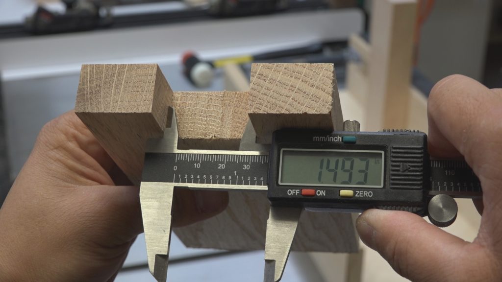 Now I’ll define my outside fingers, but I’ll purposefully oversize them. Again, I’ll make a cut, flip the board horizontally, and make another cut. Now I’ll take a measurement with my calipers. The center finger measures 1.519”, while the space between the two outside fingers measures 1.493”. That’s a difference of 0.026”. Divided by 2 and I have 0.013” that needs to be removed on each side of the inside walls of the outside fingers. I’ll add 0.001” of clearance for a total of 0.014” that needs to be removed on each side. I’ll position the dial indicator against the corner bracket on the stop block, loosen the clamp holding the track attached to the stop block, and with light taps of a mallet I’ll move the stop block over by 0.014”. I’ll take a pass on each side of the outside fingers. What I’m left with is a tight fitting finger joint.