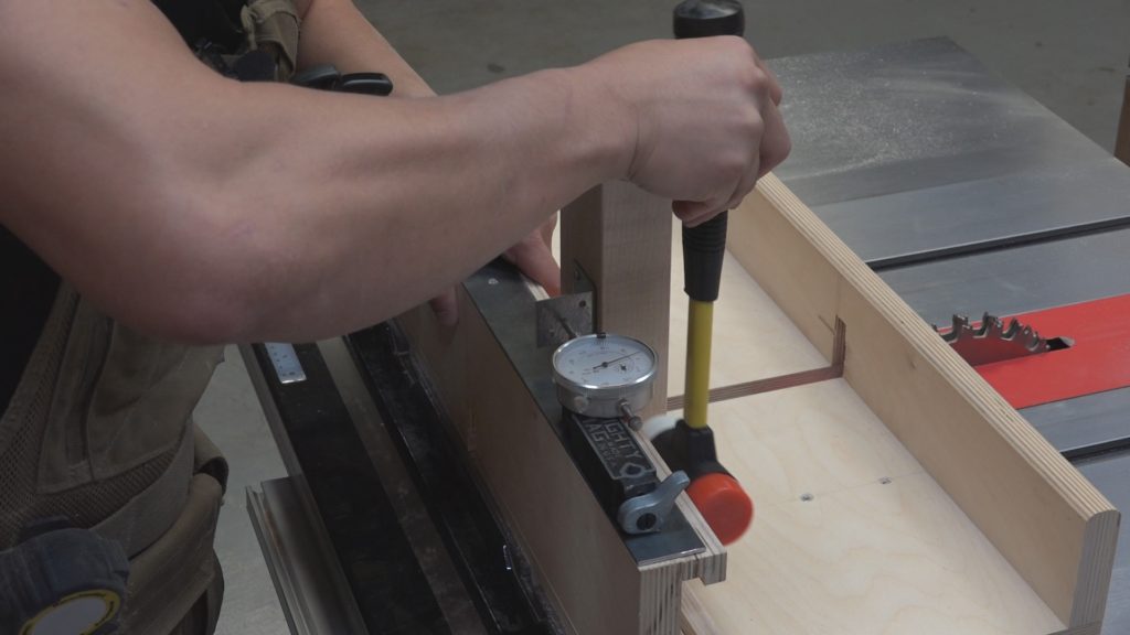 The back fence consists of a single layer of 1” Baltic Birch and two layers of 1/2” Baltic Birch. The layers are attached using 3/4” brad nails and glue. The moveable track is not attached but rather used as a spacer. To ensure the pieces remain flush along the bottom of the back fence, I push the pieces up against a shop made right angle clamping guide as I glue and nail down the pieces. Once all the layers are attached, the two pieces of the moveable track are attached to each other so that the two pieces move as one. Then, the zero clearance insert is attached using two 3/4” screws. Screws are used to make the zero clearance insert easily replaceable. Lastly, the flat metal bar is attached to the top of the fence using screws. This will become the point of attachment for the dial indicator attached to a magnetic base (Mighty Mag.)