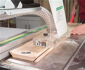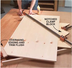 | 1. Make all the shelves identical by using one shelf as a template. Cut the angled corners on the other shelves a bit oversize. Clamp the rough-cut shelves to the template, and trim flush with a router. |