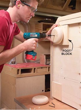 | 20. Screw the bun feet to the foot blocks. The thinner foot block in back allows the cabinet to sit level on a sagging floor. Sources(Source information may have changed since the original publication date.) Lee Valley & Veritas, leevalley.com, 800-871-8158, Two Iron Pendant Pulls, 01A60.30, $6 ea.; Two Iron Oval Pulls, 01A60.40, $7 ea.; Twelve Part Wrap Iron Hinges with Minaret Tips, 01H31.50, $4 ea.; One 18″ Black Full-Extension Drawer Slide, 02K11.18, $16 ea.; Four 3/8″ x 1/10″ Rare Earth Magnets, 99K32.03, $0.50 ea.; Public Lumber Company, publiclumber.com, 313-891-7125, Two 3/4″ birch plywood, $50 ea.; Two 3/4″ clear or knotty pine plywood, $70 ea.; One 1/4″ clear or knotty pine plywood, $40 ea.; 50 bd. ft. pine, $4 per bd. ft. Adams Wood Products, adamswoodproducts.com, 423-587-2942, Woodworker’s Supply, woodworker.com, 800-645-9292, One pint Titebond wood molding glue, 921-971, $7; One gal. sealcoat (shellac), 119-459, $23. Woodcraft, woodcraft.com, 800-225-1153, One Trans Tint Golden Brown Dye, 128482, $17. This story originally appeared in American Woodworker July 2003, issue #101. |
