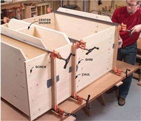 | 10. Apply cove molding under the top and against the edge of the nailers. Hold the molding in place with spring clamps as you go. Fasten the molding with glue and pin nails. |