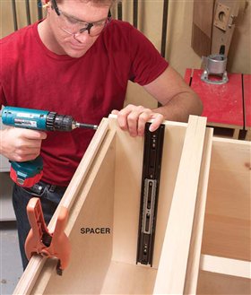 | 4. Create a ledge below the doors with solid wood fastened to the underside of the component shelf. Use a 7/8-in. spacer block to keep an even reveal. |