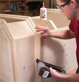 | 9. Rout the ogee edge on the top. Just glue on the edging, sand flush and rout. Then screw the finished top onto the cabinet. |