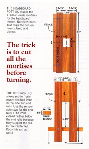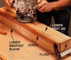 2. Rout mortises in the lower sections of the bedpost blanks. Use a simple jig, referenced from the inside edge of the post (see Fig. B, below). This jig works for the shallow, full-length mortises for the metal bedrail fasteners and for the two deep, half-length mortises for the loose tenons that join the posts, end rails and footboard. It’s reversible, so it works on all the posts–just flip it over and remount the fence.