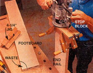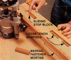 5. Rout double mortises for loose tenons in the end rails and footboard. Because the openings in the two rail jigs are identical to those on the lower post jig, you can use the same sliding stop blocks.
