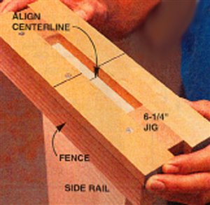 4. Use the 6-1/4-in. rail-mortising jig (see Fig. B, below) to cut the shallow, full-length mortises in the side rails for bedrail fasteners. Its fence makes it easy to position. Just align the centerline on the jig with one drawn on the end of the rail.