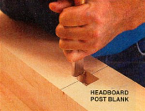 6. Square the corners of the mortises cut with the headboard post jig. These mortises are for the headboard tenons. These tenons have no shoulders, so the mortises must be neat. Use a sharp chisel and cut into each corner from both sides.