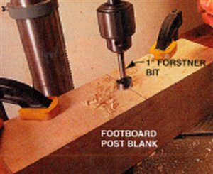 7. Drill a centered hole for the blanket rail in the upper section of each footboard blank.