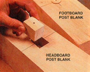 24. Align the mortises when you glue the two sections of the headboard posts. An offcut from the headboard blank works great as an alignment tool because it’s the right thickness to simulate the tenons. You don’t need to clamp this glue-up–once the pieces are seated and aligned, gravity does the job.