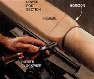 9. Round the pommel on the lower post section with a detail gouge. Make a series of rolling cuts. Start at the reference line, and work across the pommel, rotating the gouge clockwise as you cut into the center. To see the rounded shape you’re making, watch the horizon of the blank as you make the cut.