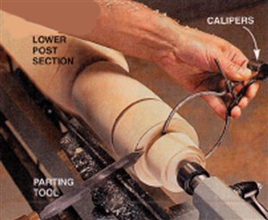 Turning the postsYou only need four tools to turn the bedposts: two gouges, one for roughing the square blanks into cylinders and another for detail work, a parting tool and a skew.