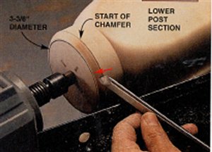 12. Chamfer the top of each lower post section with the skew chisel. The chamfer helps disguise the joint with the upper section. After truing the face of the post, mark the small diameter of the chamfer on it. Then, using the long point of the skew, make slicing cuts to this line.