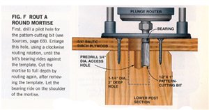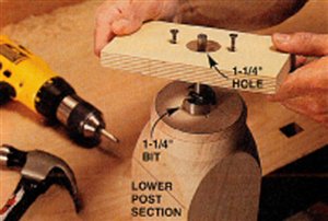 13. A router jig guarantees a centered hole in the lower post section. Use the hole left from the lathe center to position a Forstner or spur bit. It must have a long lead point. Secure it with a hammer tap. Slip the routing template over the barrel of the bit and screw it down. Then remove the bit.