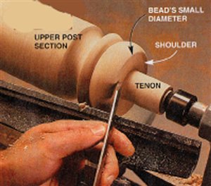 14. Turn a tenon at the bottom of each upper post section. Undercutting its shoulder assures solid contact and a tight fit with the lower section. Hide the joint by matching the small diameters of the bead on the upper section and the chamfer on the lower section (Photo 15).