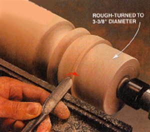 Turning the posts and blanket railTurning a big chunk of wood down to small diameters requires a cautious approach. When you shape the tops of the posts, operate your lathe at a slow speed (500 rpm max.), use sharp tools and make light cuts. Don’t turn all the way down to a small diameter in one shot. It makes the blank susceptible to spiraling, chattering or breaking. Leave the wood as big as you can as long as you can.