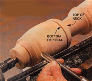 16. Work the top down in stages. First, establish two reference points; the bottom of the finial and the top of the neck (see Fig. C, below). Then alternate between roughing out the neck and the top of the finial, slowly reducing the diameters as you work back and forth.