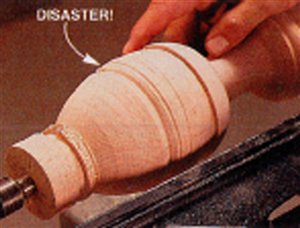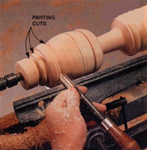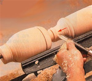 18. Shape the finial. Map out its profile with parting cuts made to critical diameters (see Fig. D, below). Then just “connect the dots.” You’ve finished turning the profile when the parting cuts disappear. If you want all of the finials to be identical, us a a template.