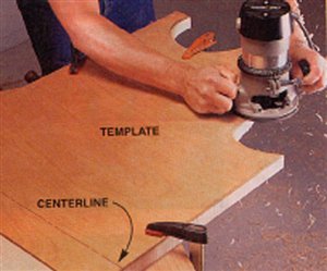 20. Rout the headboard’s profile using a pattern-cutting bit (see Sources, below) with a top-mounted bearing and a template. After cutting the blank to exact width and length, attach the template and saw away most of the waste with a igsaw—this piece is too big to horse around on your bandsaw. Rout one side, flip and realign the template. Then do the other side. Use the same template for the curves on the footboard.