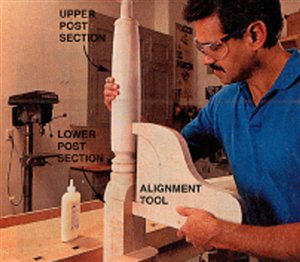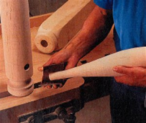 8. Plug the holes, without glue, in the upper post section blanks before you begin turning. After the posts are turned, insert screws and pull out the plugs.