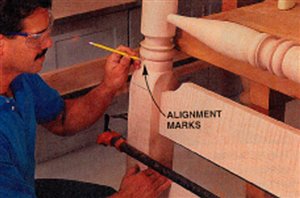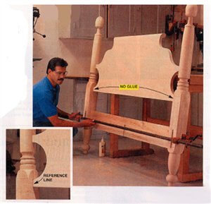 27. Mark the footboard posts for gluing. First glue the three pieces of the blanket rail together. Then dry clamp the entire assembly. Gently rotate the upper post sections to align the blanket rail with the footboard. Mark both sections of each post. Glue the posts separately, then glue the entire footboard assembly. Use four long clamps, two on each rail.