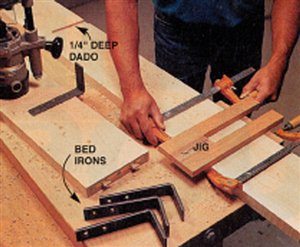 28. Mount the bed irons after cutting dadoes in the side rails with the bed iron jig.