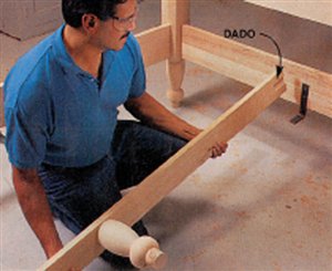 29. A center leg supports the box spring. I used the bottom end of the practice leg I turned. Dadoes on the ends of the rail keep it on the bed hangers. |