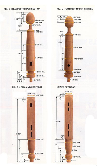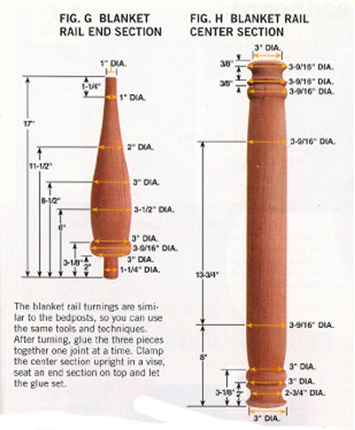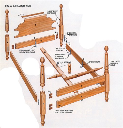 MaterialsYou can make the entire bed from 6/4 material (6/4 lumber is rough sawn at or slightly over 1 1/2-in thick). We used curly soft maple (see Sources, page 69). You’ll need 50 board feet (bd.ft.)for the rails, headboard and footboard. Make the blanks for the four posts and the turned blanket rail at the foot of the bed by stacking three pieces and gluing them together. Each blank for these big turnings contains about 10 bd.ft., so you’ll need a minimum of 50 bd.ft. for them. Plan to buy about 130 bd.ft. for this project. The extra 30 bd.ft. allows you to make a practice leg and accounts for waste, which is inevitable. Consider using 16/4 material for the bedposts. It’ll cost a couple hundred dollars more, but you’ll save yourself time and trouble because you won’t have to glue up the blanks. Besides, every time you look at the posts on your finished bed, you’ll be glad you spent the money because you won’t see any glue lines. Mail-order suppliers often stock 16/4 maple and cherry (see Soures, below). We’ve used steel bedrail fasteners (see Sources, below), mounted in routed mortises, instead of traditional bed bolts, which are notoriously hard to install. When these fasteners are properly fit (see Fig. A, Detail 1), you should be able to seat or loosen the siderails with the tap of a small mallet. They make assembling or disassembling the bed a snap. This design accommodates queen-size mattress/box spring combinations of different thicknesses. The 14-in.-thick set we used sits 25in. above the floor, although there’s nothing magic about that height. If you plan to buy a new mattress set, buy it before you build. Today’s sets are often much thicker then 14 in. You can adjust the size or location of the bed irons so your mattress sits at a comfortable height. Bed irons are available in lengths from 3 in. to 12 in. (see Sources, below). The irons may extend far below the side and end rails. A bedskirt will hide them from view.