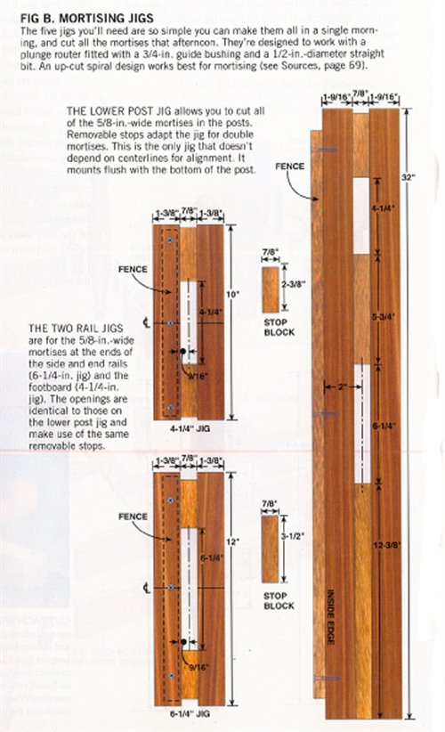 The Headboard Post JigFig. A: Exploded ViewFig. B: Mortising JigsFigs. C & D & E: Headpost/Footpost Upper/Lower SectionsFig. F: Rout a Round MortiseFigs. G & H: Blanket Rail End/Center SectionsFig. J & K: Headboard Roll Pattern/Headboard PatternFig. L: Allowing for Seasonal MovementThis story originally appeared in American Woodworker February 2001, issue #85. |