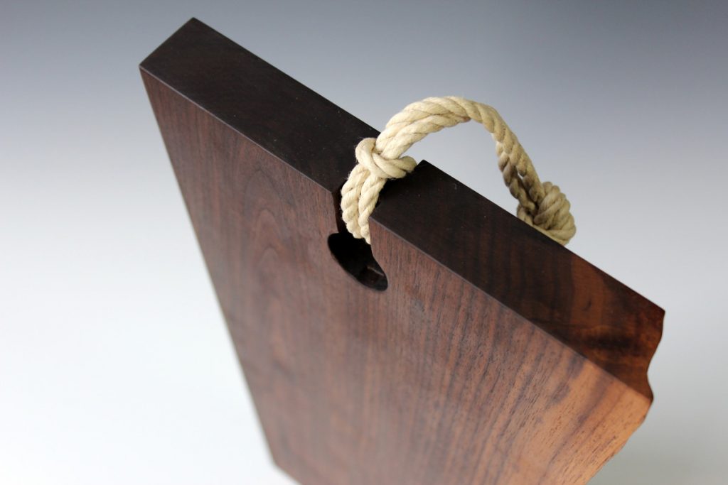This week I built a jig to help me in routing the two grooves at the head of my signature cutting boards. My cutting boards have two grooves that intersect with the wide hole and enable the hanging rope to nest in them.