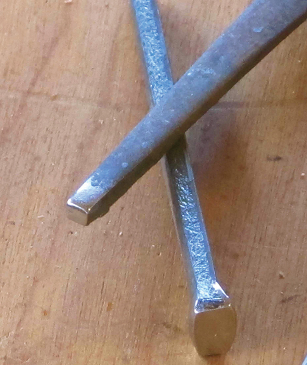 Very often in my work as a decorative arts conservator or creative artisan who works in a variety of materials – wood, steel, aluminum, brass, pewter, silver, ivory, mother-of-pearl, paper, leather, glass, plastic and composites, to name a few – I have needed one special tool to complete the task. Whether that tool was a special-shaped or precisely sized punch, a chasing tool (“chasing” is the process whereby you hammer the surface of a metal object using a punch-like tool and a hammer to create a desired surface texture), metal carving/engraving chisels, or a burnisher, many years ago I discovered a near-perfect source of the high-quality raw material from which I could make fine tools – concrete nails. I especially like them because they are easily available and ultra-cheap, yet perform and work nearly as well as expensive tool-steel stock.
