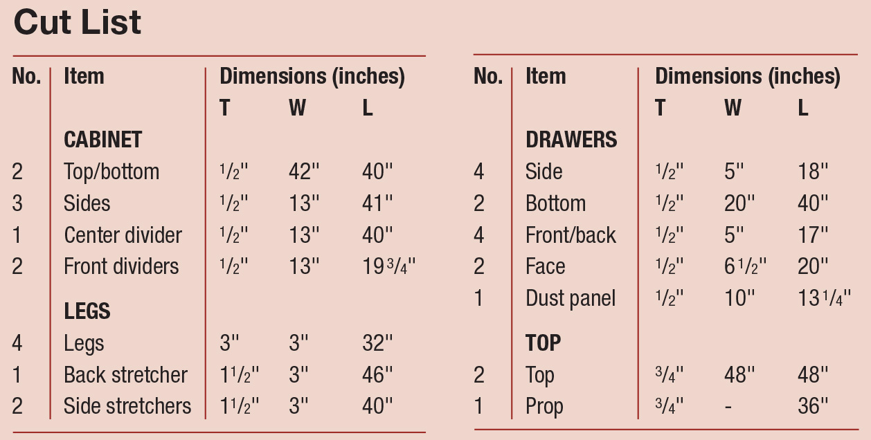The cabinet at the bottom of the table serves as a platform for the CNC, a housing for the drawers and torsion box to keep the whole assembly table from racking. Start by cutting the top and bottom of the cabinet to 40″ x 42″. Then rip the 13″ parts for the sides and dividers of the cabinet. Cut all of these pieces at once so that they’re perfectly consistent.