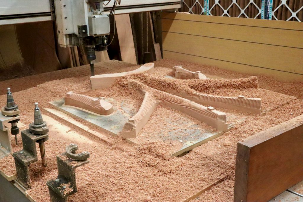 A CNC router while milling a block of Sapele wood that will be shaped with hand tools later on.