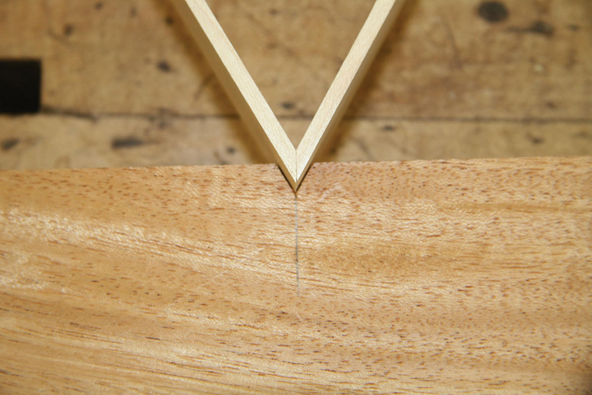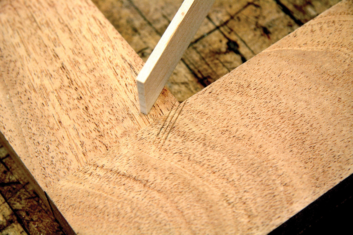 2) Diagonals. Install 1⁄8″-thick maple bars (the same width as the thickness of the frame members) from corner to corner. Strike a centerline using a long straightedge placed where the rails and stiles meet to form the inside corners. Scribe lines half the thickness of the bars (1⁄16″) parallel to and on either side of this centerline.