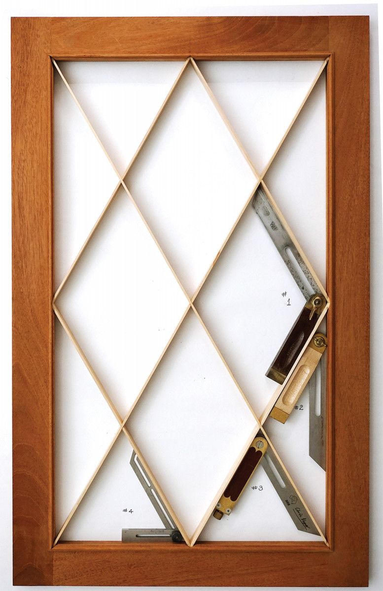 So I worked out how to make diamond divided light doors of any size; I share the pictorial process with you. Before you dive in, study the drawing below and picture 12 – those show the four angles that get bisected to find the complementary miter angles.