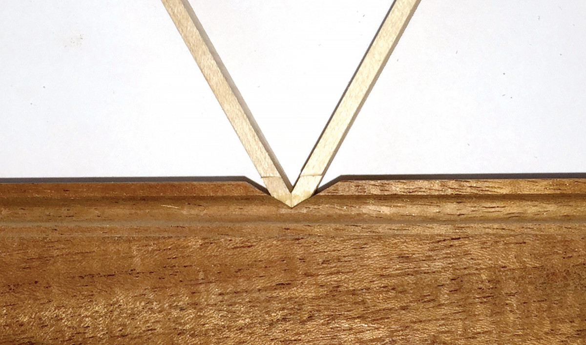 14) Make the cuts. Now lay out and cut the bird’s mouths into the inside edges where all of the bars are mitered into the door frame, using a handsaw and chisels. Rail moulding: Bisected angle #4