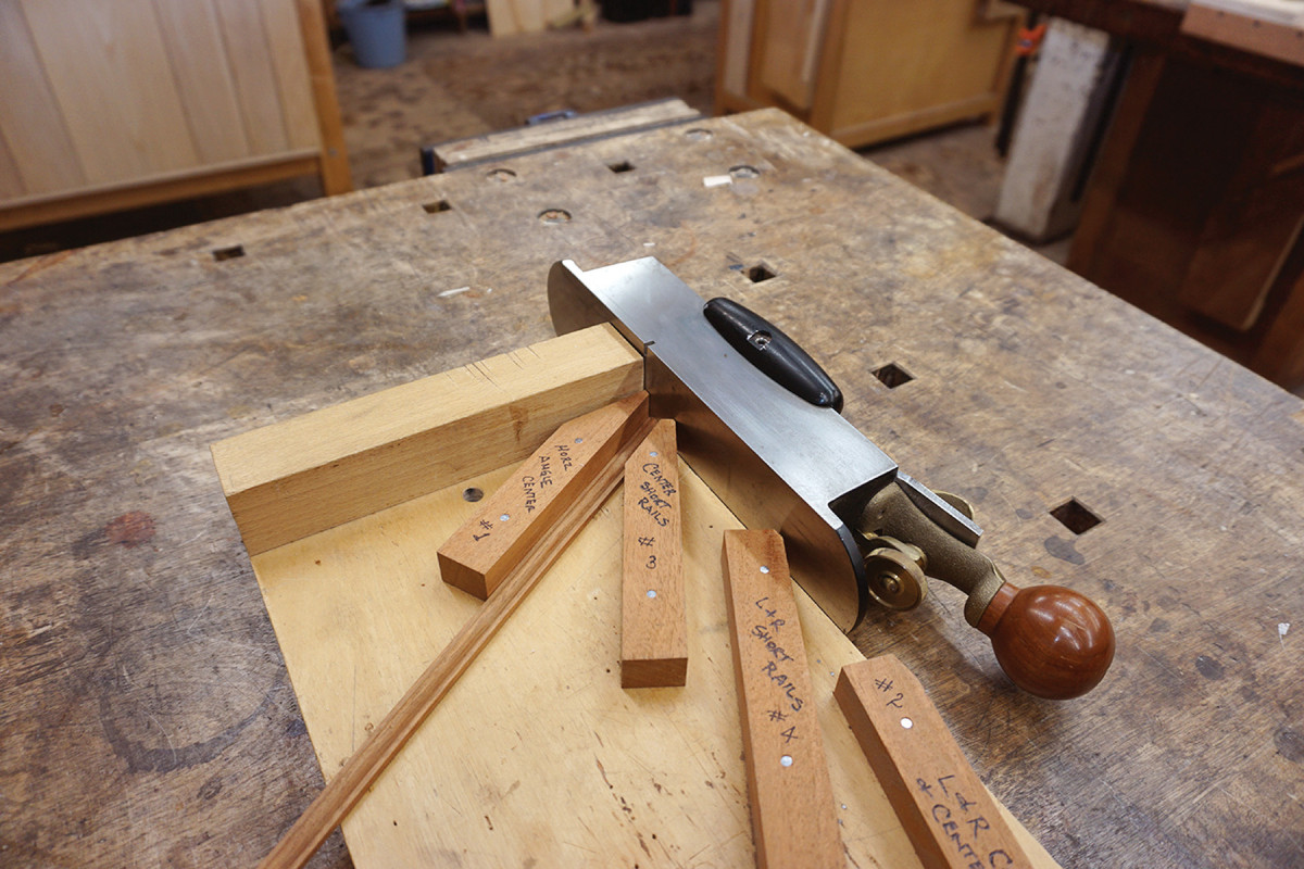 Align the moulding pieces to the correct fence, with the end at the edge of the board. Shoot the ends with a plane that has an iron ground and honed straight and square, and that projects parallel to the bottom of the plane. This plane setup ensures the miter has only one angle when it is cut.