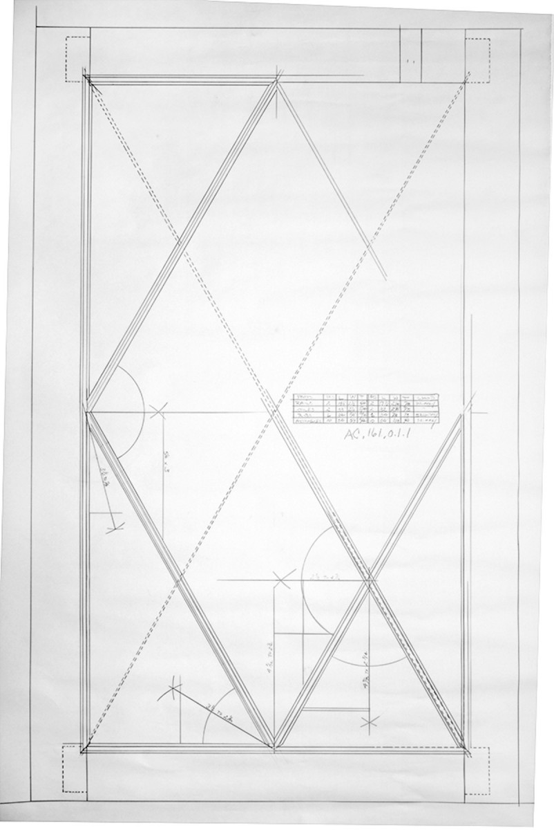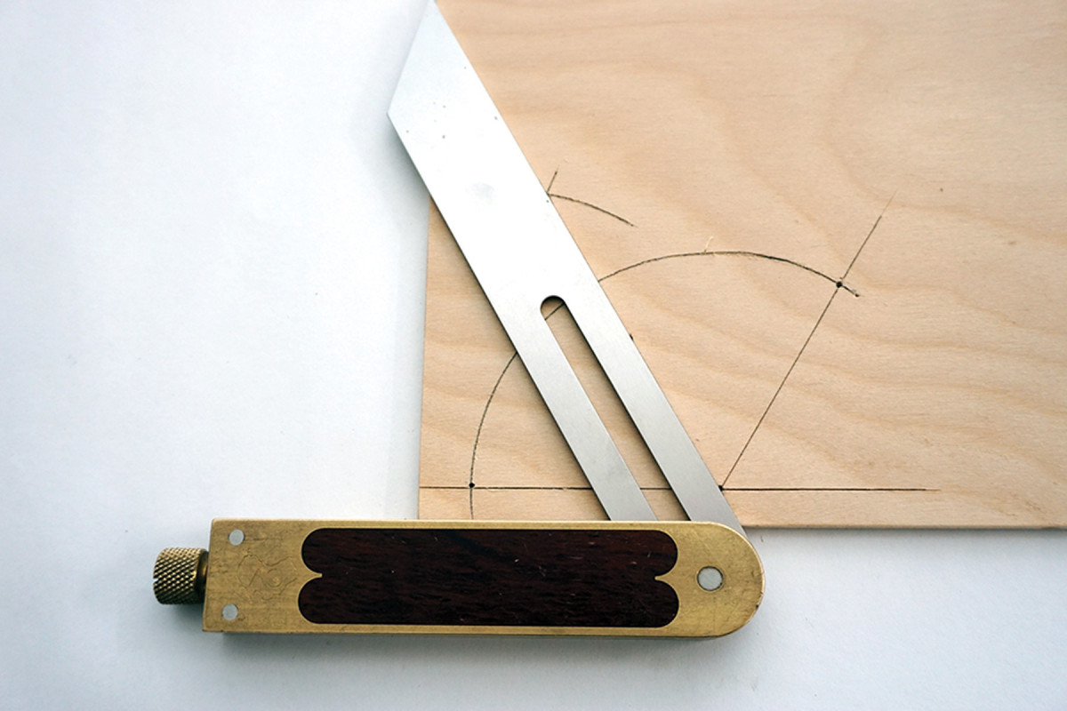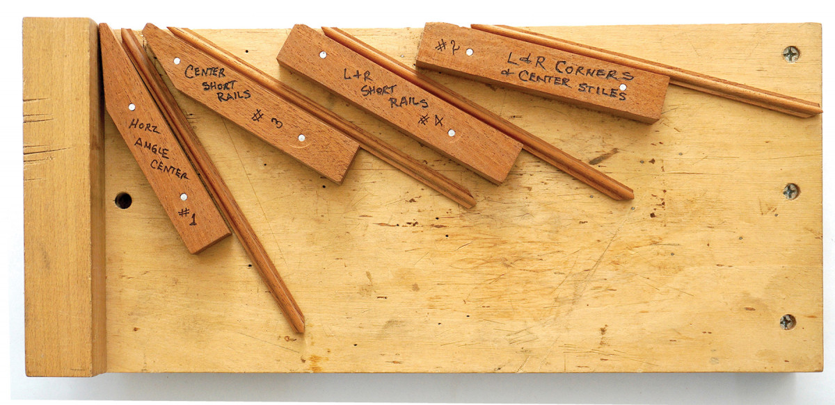 13) Angle board. The numbered drawings on the angle board match the bevel gauges as numbered at left. The centerlines are the four bisected angles needed for this door.