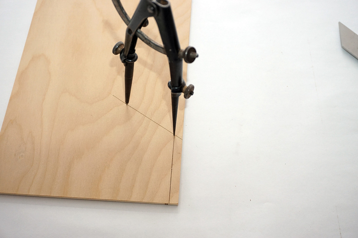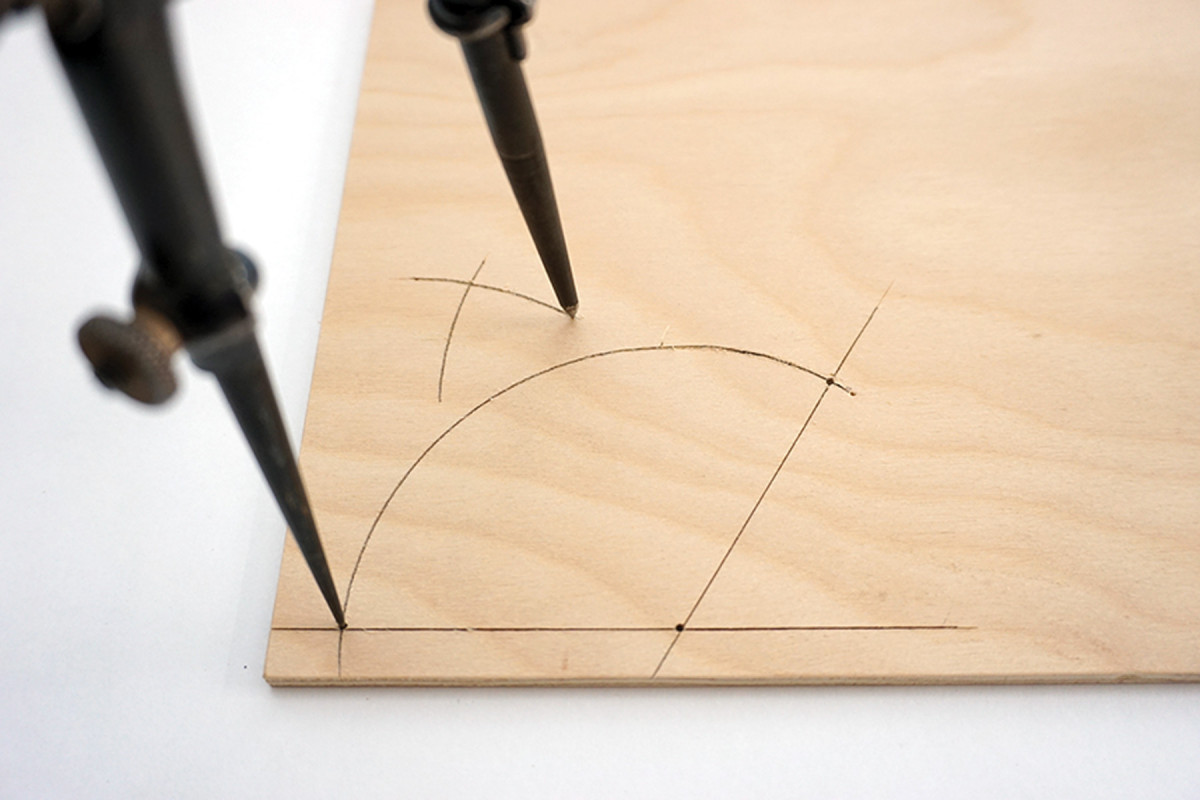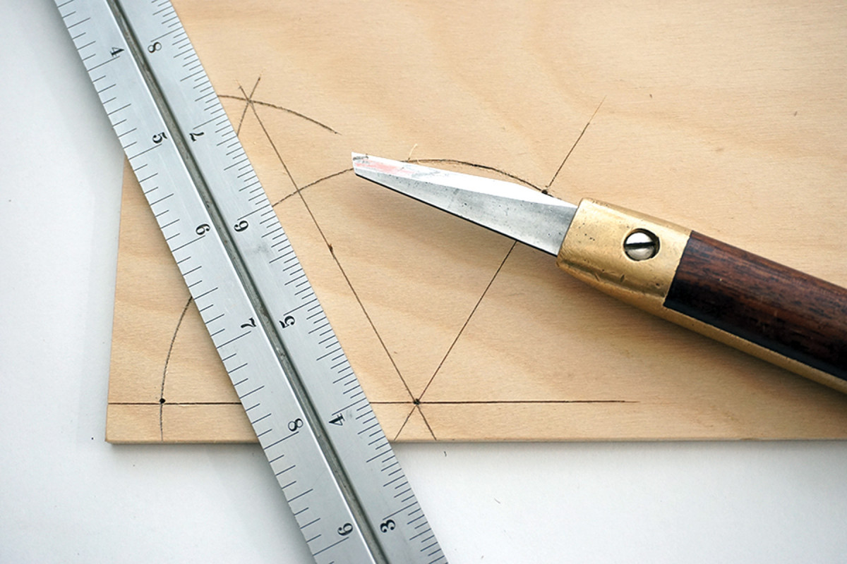 9) Position a straightedge so it cuts through the previous intersecting arcs as well as the point of intersection of the baseline and angle line, then scribe a knifeline.