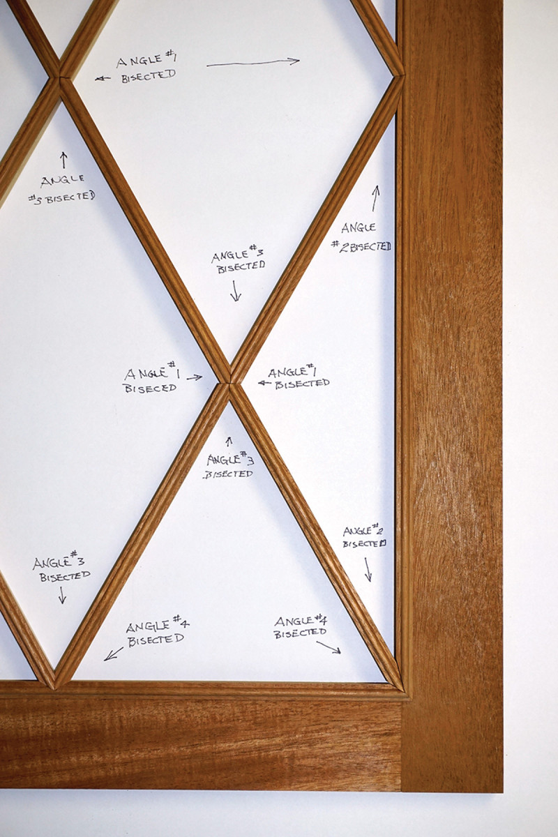 6) Large diamond. For installation of the four remaining bars, scribe a centerline on each rail and stile; the bars will be aligned with these, crossing the corner-to-corner bars to form a large diamond in the frame.