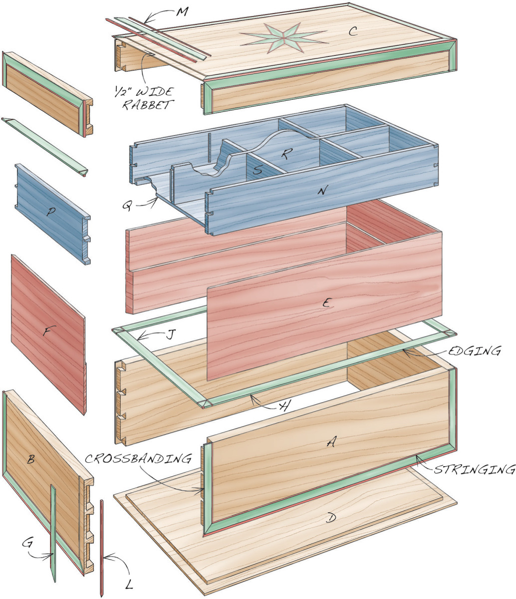 This box is embellished with ebony stringing and 1/16″ thick cherry crossbanding, edging and inlay (Fig. A). I purchased the stringing (see Sources, page 42) and cut all of the 1/16” thick cherry pieces from solid wood. Alternatively, you could buy 1/16″ thick cherry veneer (see Sources).